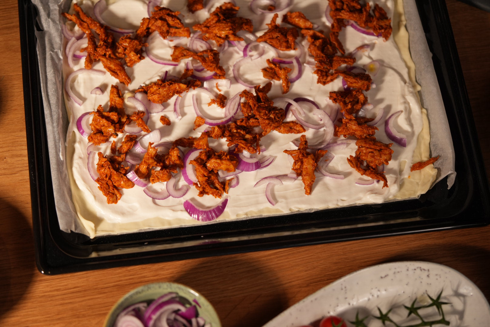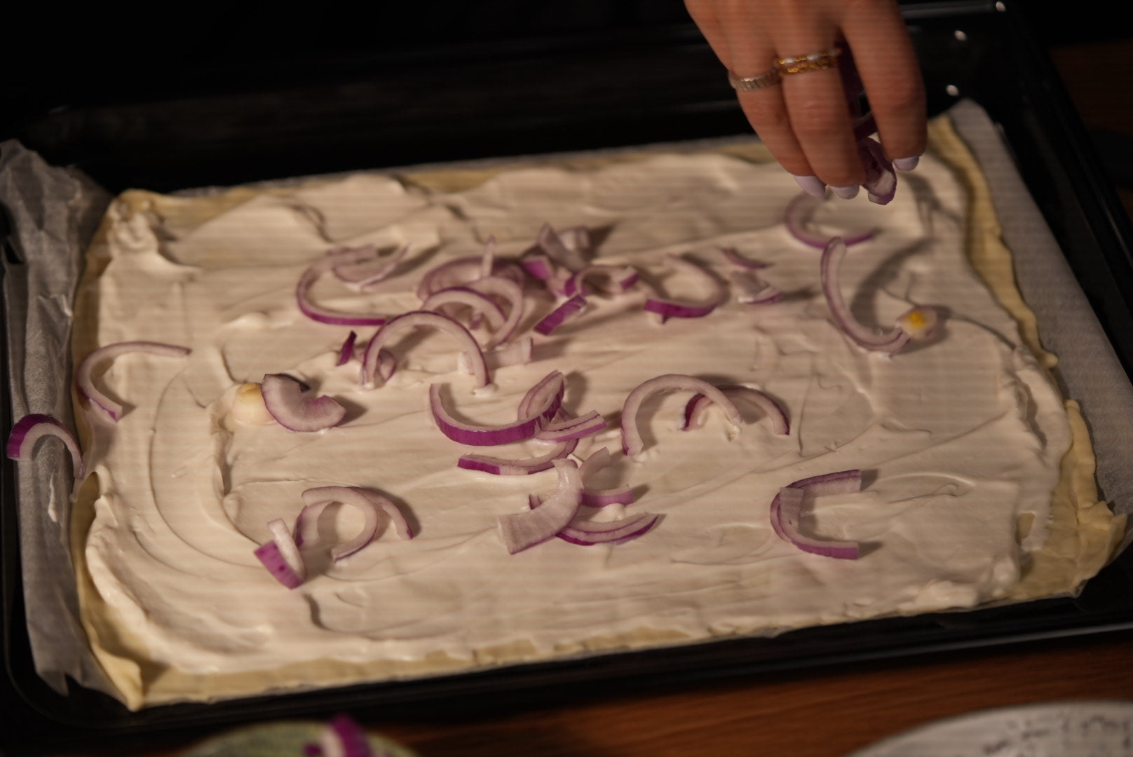 1. Roll out the tarte flambée dough and place on a baking tray.
