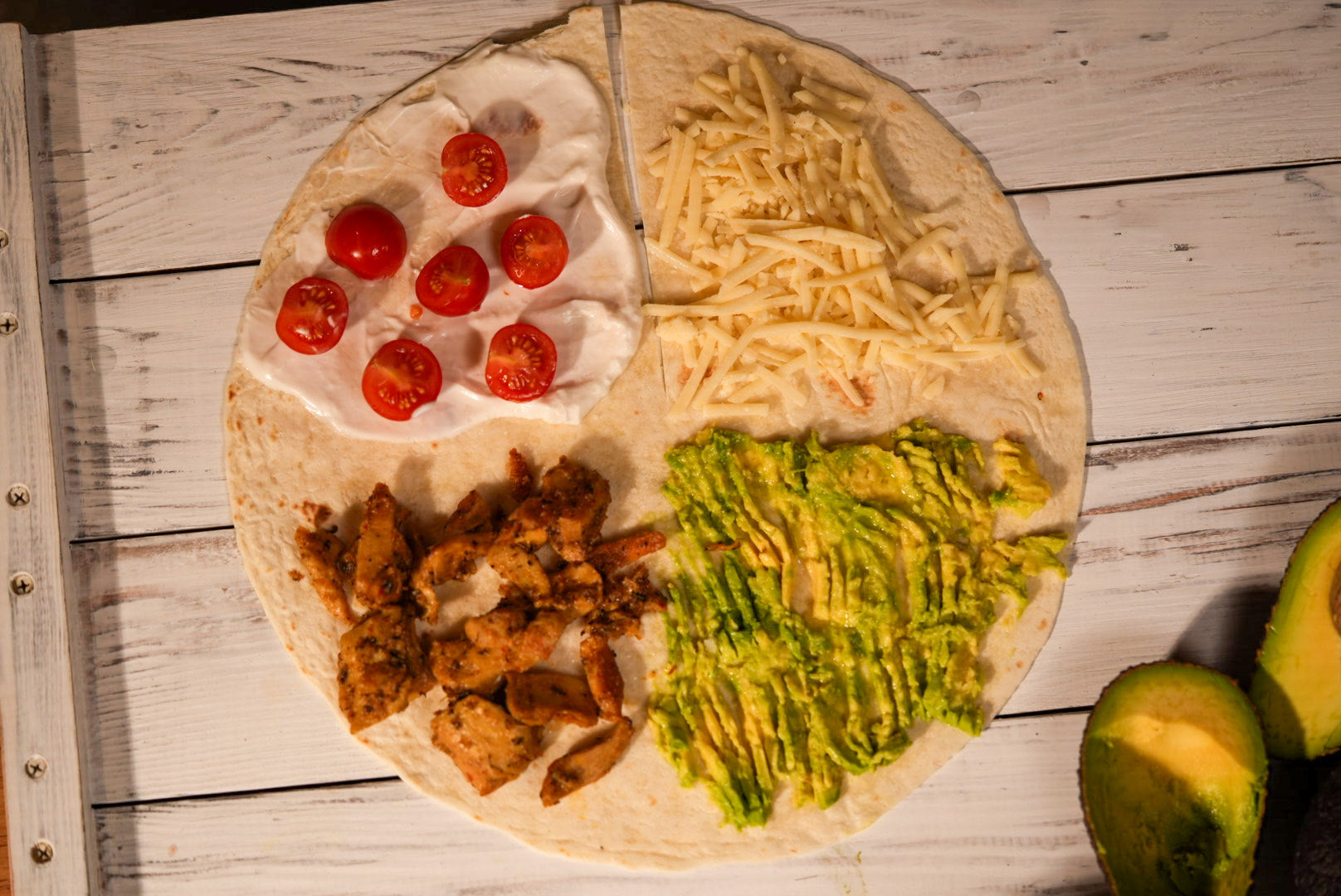 1. Cut wrap at the bottom to the middle. Cover each quarter of the wrap with different filling.