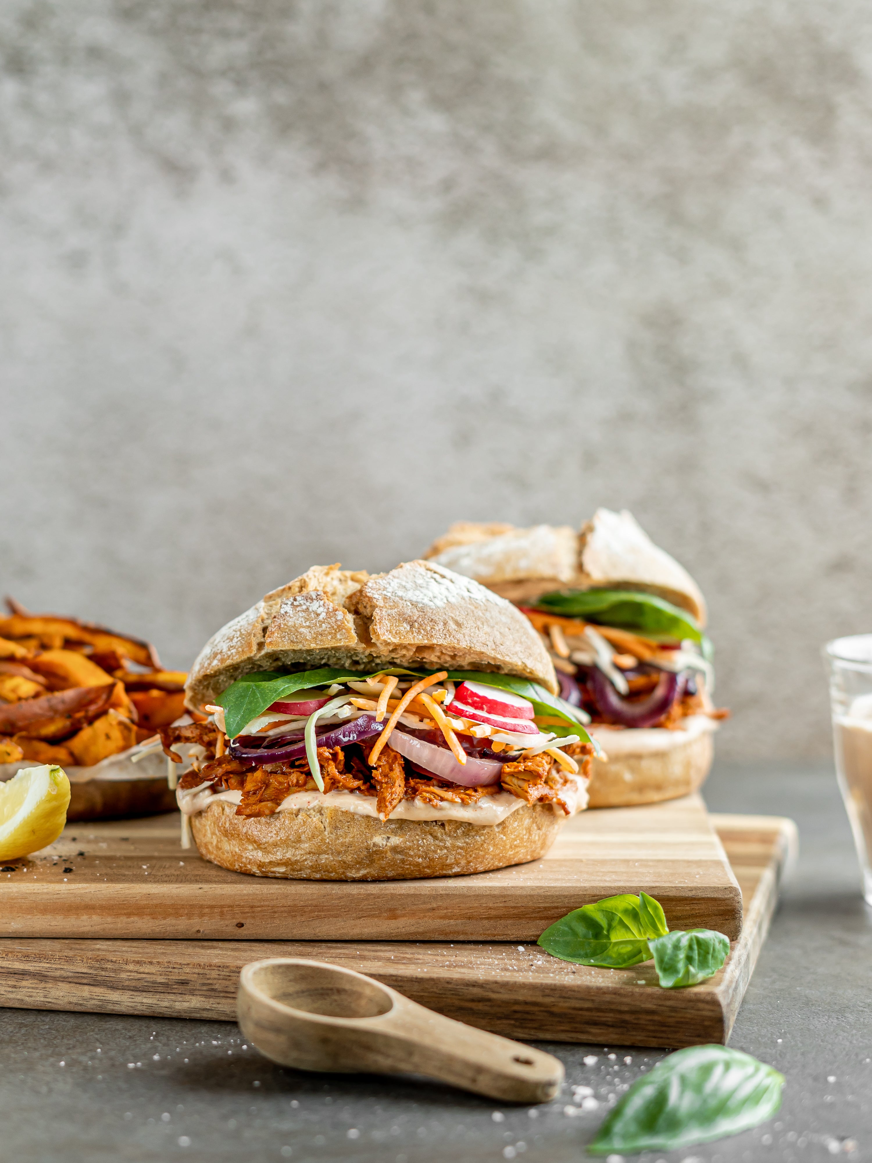Peel onions and cut into fine rings. Heat olive oil in a frying pan, add onion rings and season. Sauté over medium heat for about 4 minutes until translucent. Add agave syrup. Continue to sauté, stirring occasionally, for 5-6 minutes until onions are soft and set aside. Planted Sauté Pulled BBQ over medium heat for about 5 minutes, stirring occasionally and keep warm.